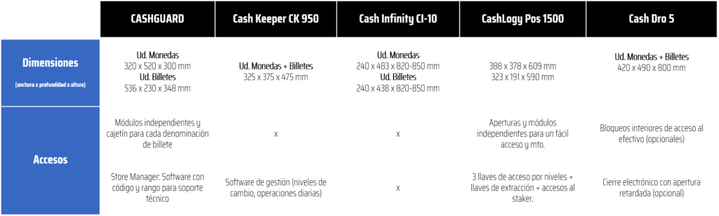 Tanto CashGuard, CashInfinity como CashLogy tienen dos compartimentos diferenciados para la gestion de monedas y billetes. Sin embargo, CashKeeper y CashDro tienen un unico compartimento para ambas gestiones.