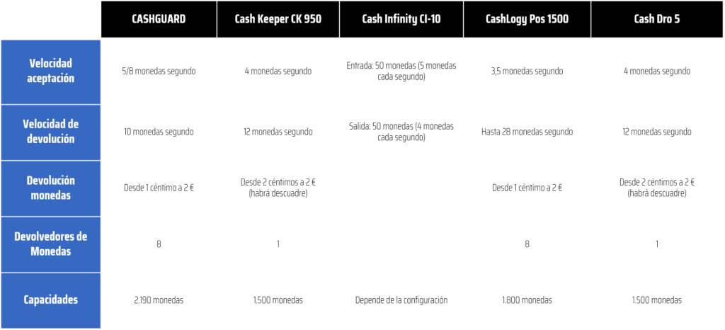 En velocidad de aceptacion de monedas, CashGuard es el claro vencedor frente al resto de soluciones de gestion de efectivo.